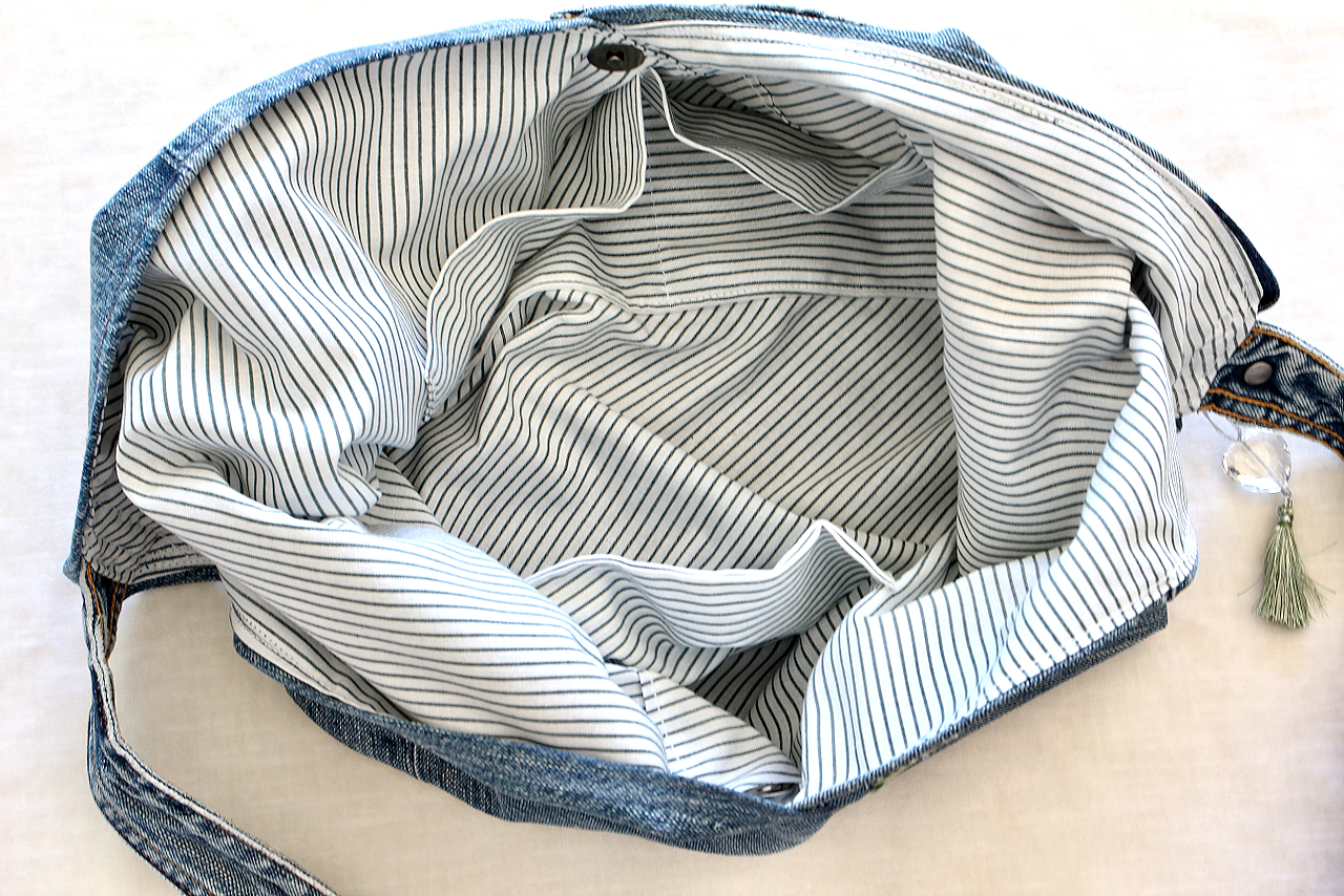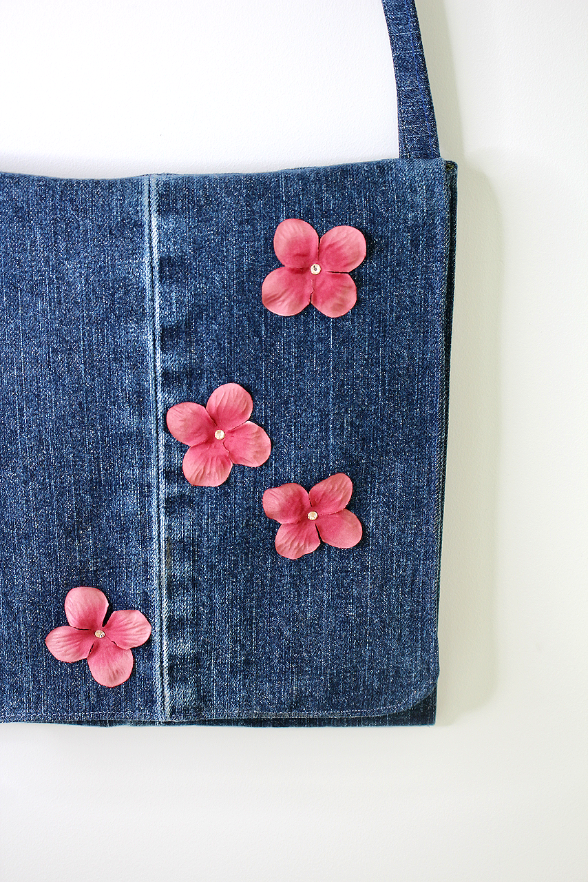 Handcrafted recycled denim hobo bag made from repurposed AG jeans with a denim pocket on one side and a red embroidered heart patch on the other. Embellished with a red tassel, floral pearl pin, and vintage pin with pearls and turquoise rhinestone. Lined with vibrant floral recycled wool fabric in turquoise and red, with two interior pockets and a magnetic button closure.